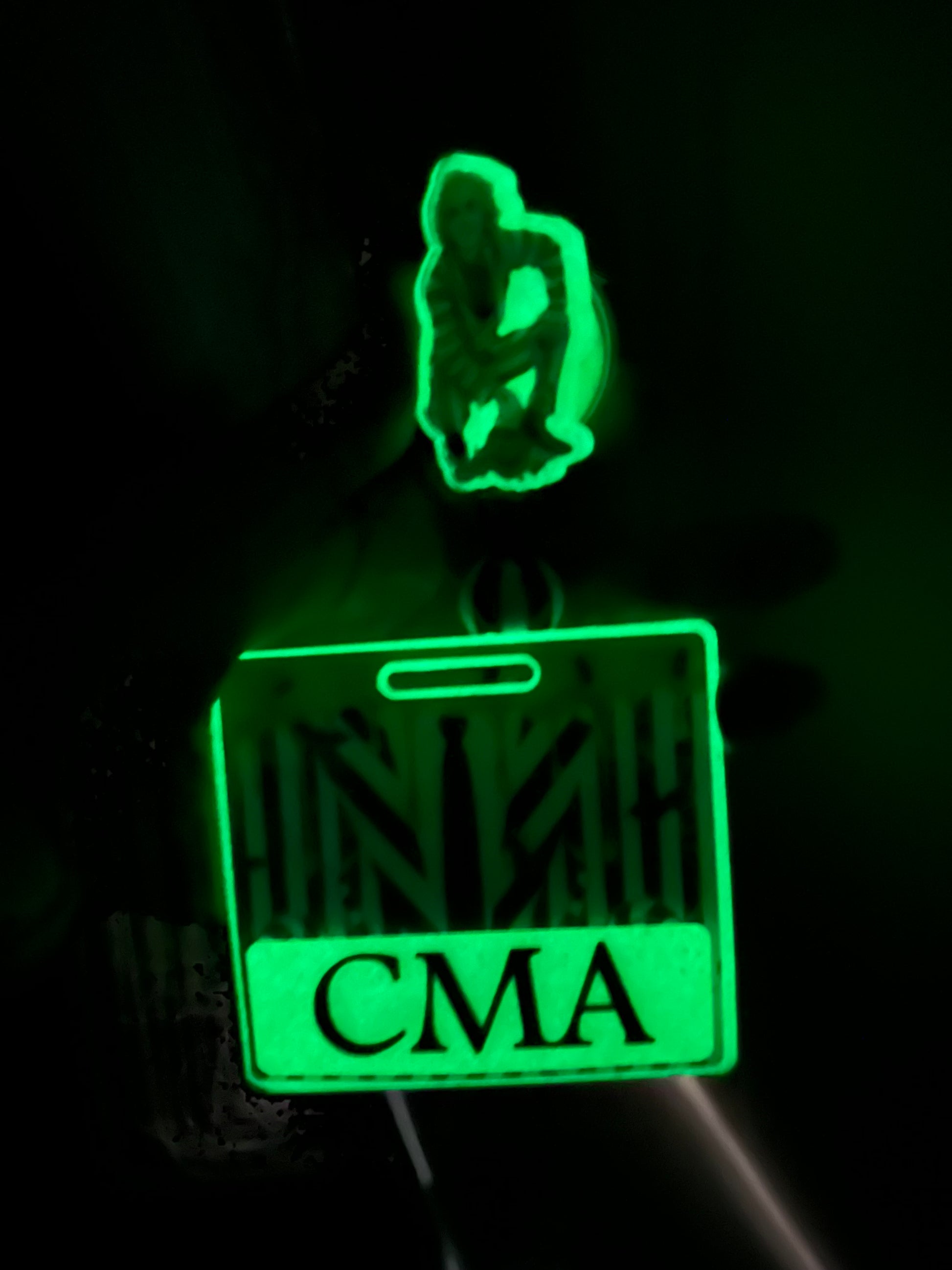 Adhered with glue to alligator clip or belt clip