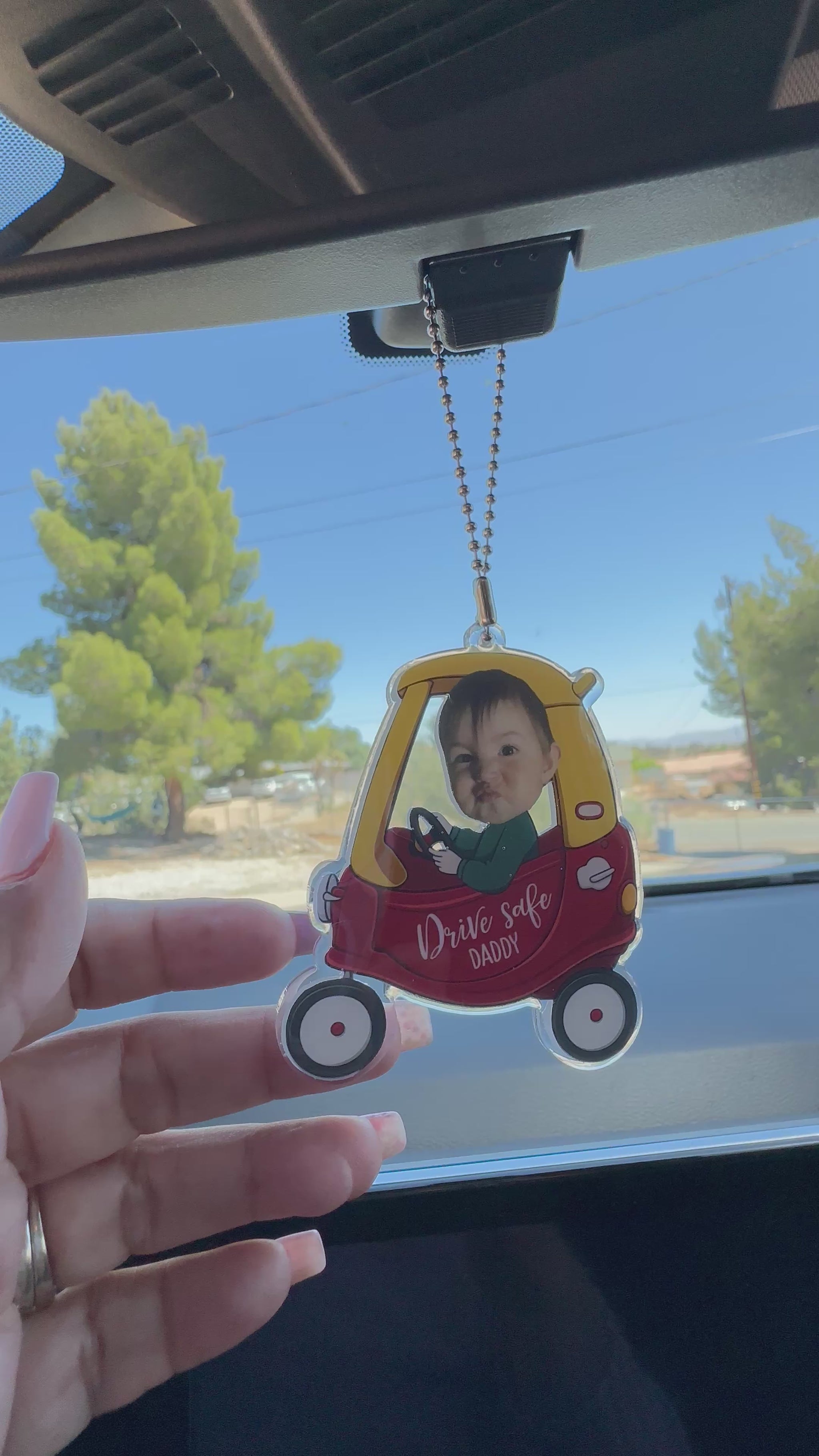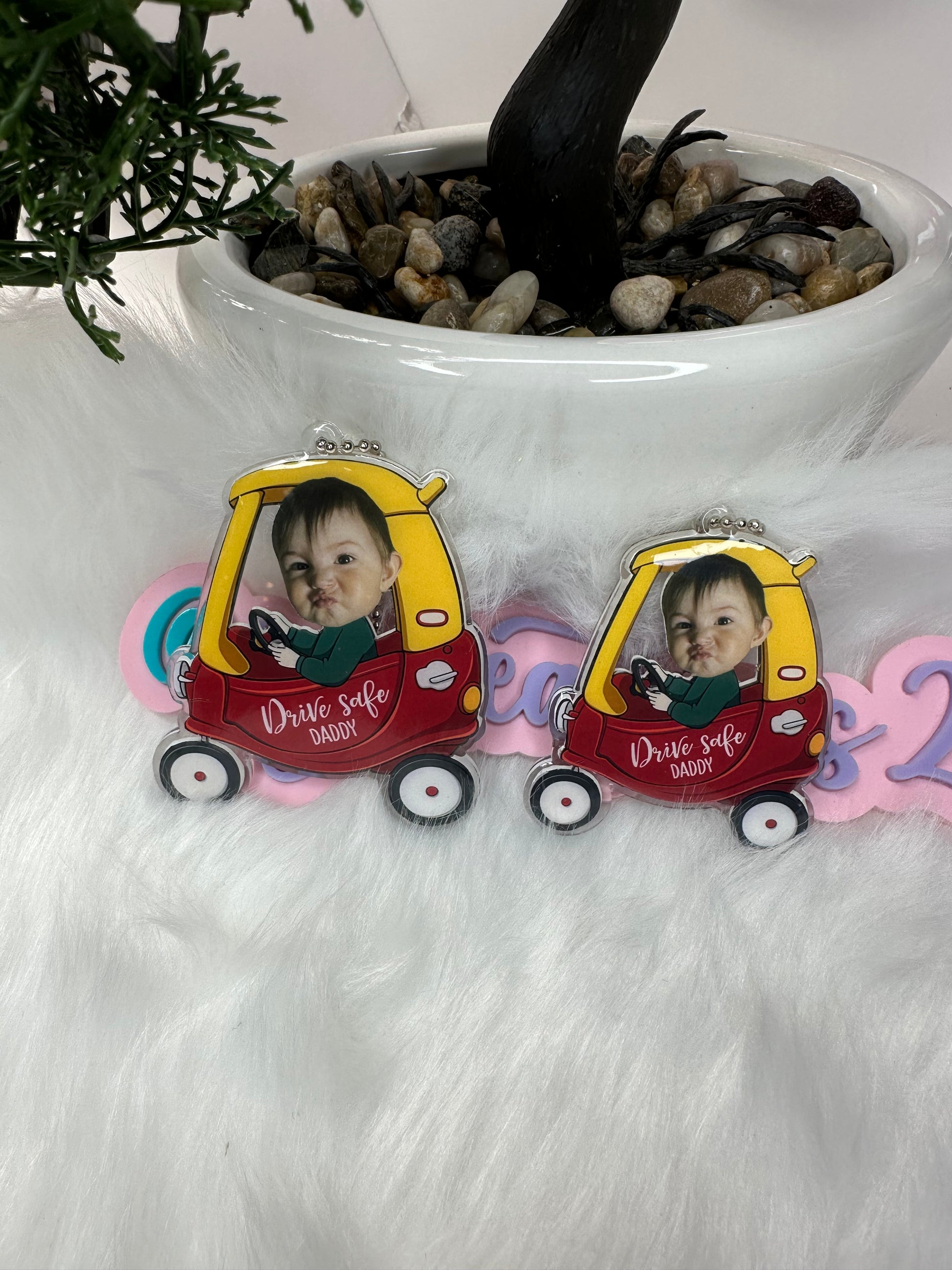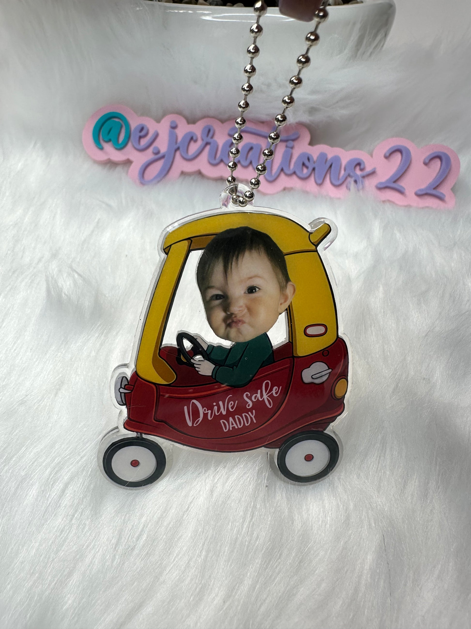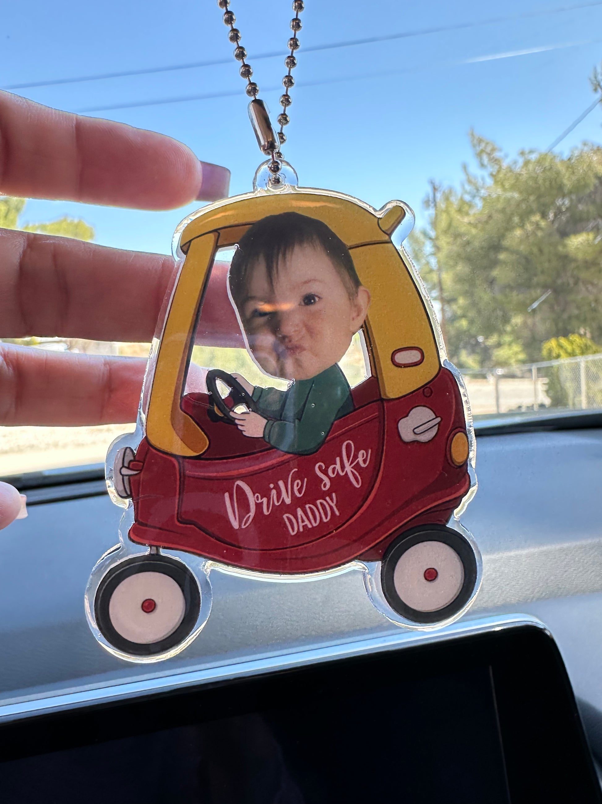 Crafted from high-quality acrylic material, this car mirror hanger is durable yet lightweight, it is seal with uv resin to protect the decal. ensuring it stays in great condition while adding a personal touch to your car. Along with your babyâs photo.Â