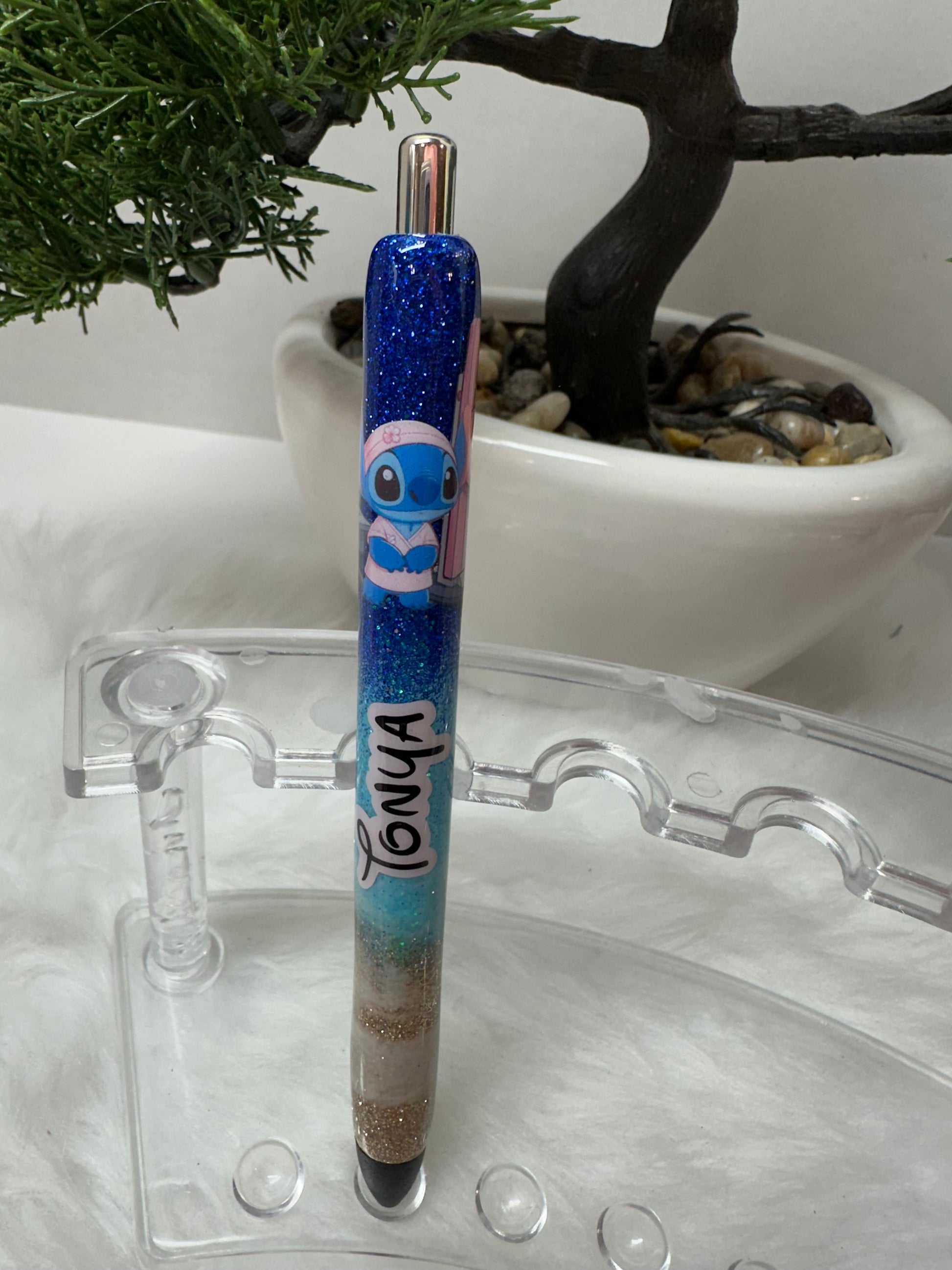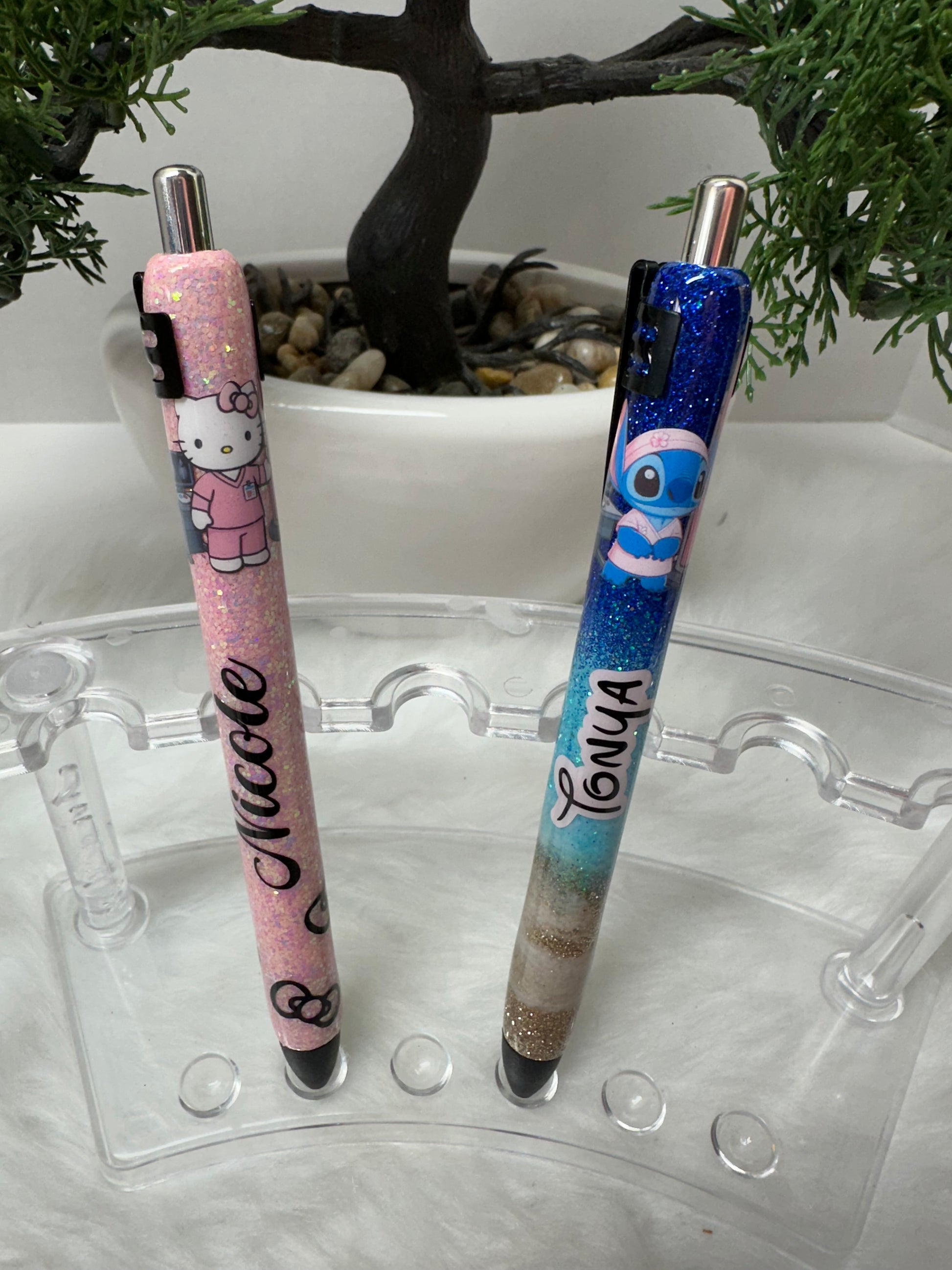 All pens and badge reels are made to order and customized with high quality glitter, vinyl, paint, waterslide and epoxy to ensure a bright sparkle and glass-like shine.